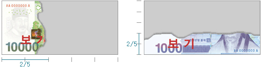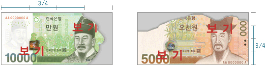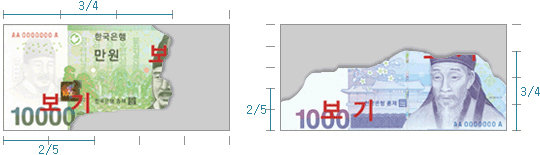 ● 은행권이 자연적으로, 또는 물·불·화학약품 등에 의해 면적이 늘어나거나 줄어들었을 때에는 그 변형된 면적을 기준으로 남아있는 면적의 크기에 따라 교환