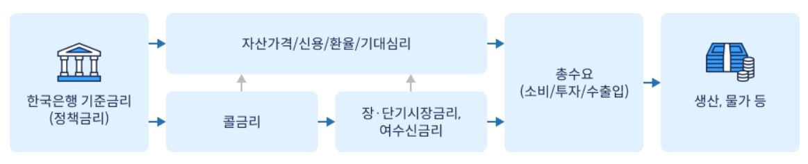 한국은행 기준금리, 즉 정책금리는 콜금리와 자산가격/신용/환율/기대심리에 영향을 미치며, 콜금리는 다시 장단기 시장금리/여수신금리에 영향을 준다. 결과적으로 이 흐름들은 총수요(소비/투자/수출입)에서, 다시 생산/물가 등에 순차적으로 영향을 미치는 파급경로를 이루게된다.